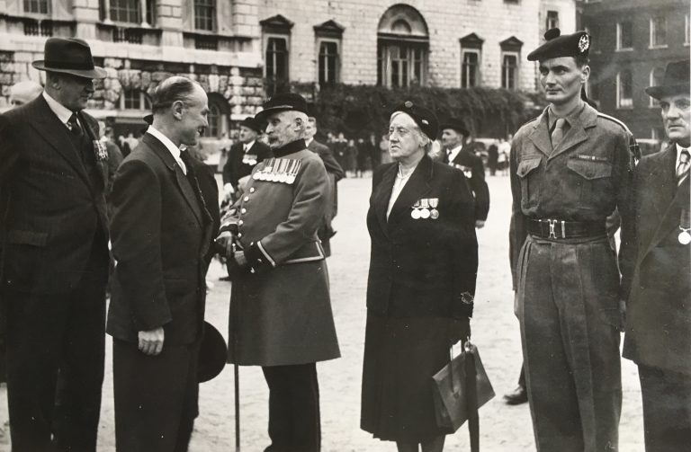 Brigadier Jackie Smyth VC MC greets a Chelsea Pensioner who had been decorated with the DCM for his actions in South Africa.